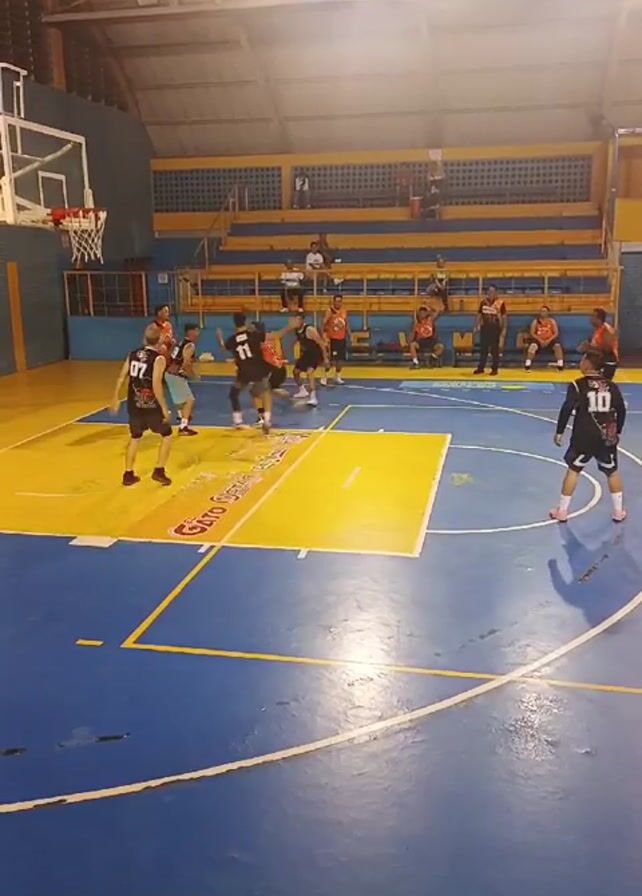In a well-lit indoor basketball court, players in black and orange jerseys engage in a game. The court is marked with yellow and blue lines, and a basketball hoop with a net is visible. Spectators sit on tiered seats in the background. The players move around the court, dribbling, passing, and shooting the ball. At one point, a player in a black jersey appears to make a shot as the team moves on.
