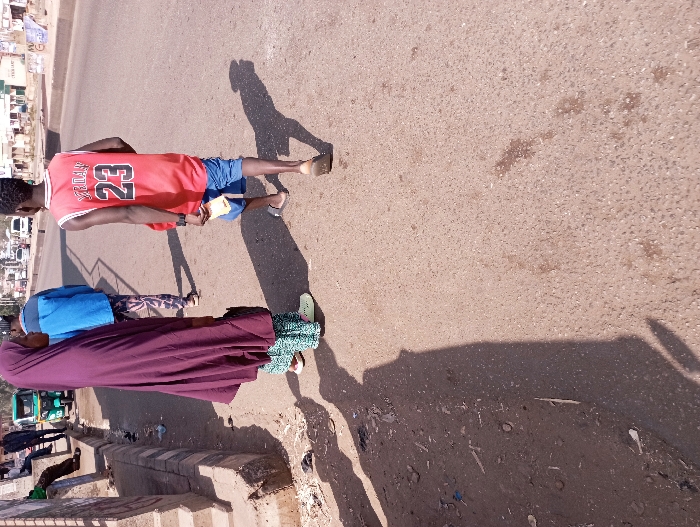 The image depicts an urban street scene in Jos, Nigeria, under direct sunlight, casting pronounced shadows. A paved asphalt road occupies the right side of the frame, bordered on the left by an unpaved, dusty shoulder containing scattered debris and a raised concrete curb with black and white markings. In the foreground, a female stands on the unpaved shoulder, facing towards the right. She wears a full-length, dark purple abaya/hijab, green patterned trousers, and light green sneakers, with a black bag held in her left hand. To her right, a male youth walks away from the camera on the paved road, wearing a red sleeveless basketball jersey with 'JORDAN 23' emblazoned in white on the back, blue shorts, and sandals. He holds a small yellow item in his right hand. Behind the female, a third individual, male, wearing a blue long-sleeved shirt and patterned trousers, walks in the same general direction. In the mid-distance on the left, a green Keke Napep (auto-rickshaw) is parked near the curb, and additional individuals are observed sitting on the curb. The background reveals a wide, multi-lane paved road with several vehicles in motion or parked in the distance, flanked by commercial buildings and sparse foliage. The specific street or area within Jos cannot be identified from visible landmarks.