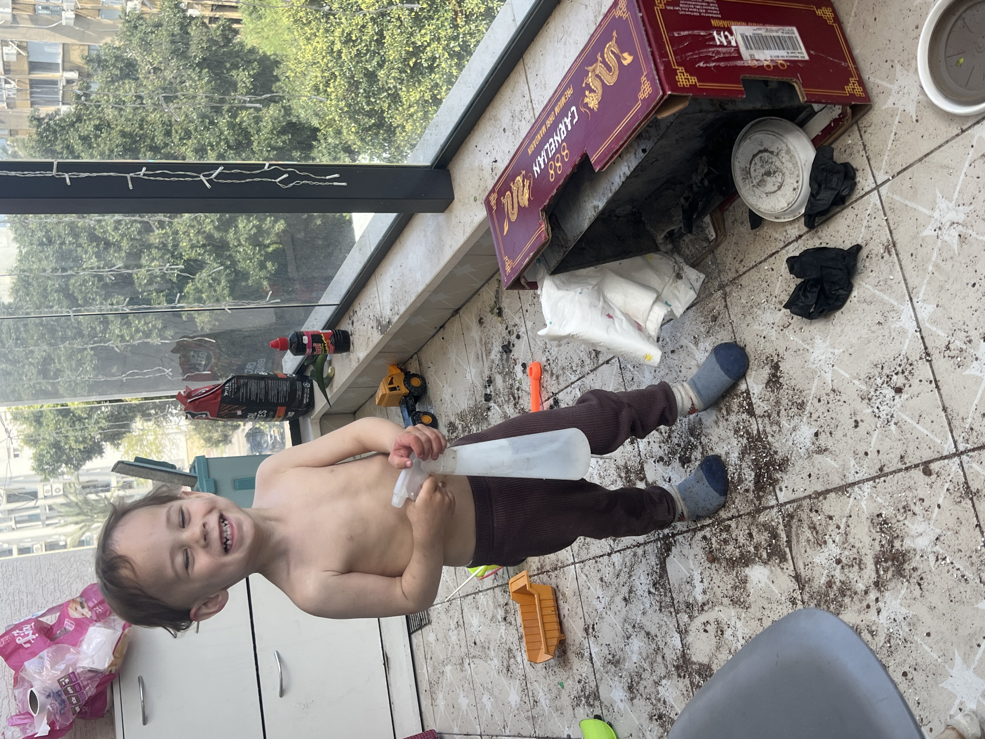 A young child stands shirtless on a tile floor heavily soiled with what appears to be dirt, holding a spray bottle. The floor is littered with various toys and debris, including an overturned box of Carnelian brand oranges. The scene is on a balcony enclosed by glass panels and overlooks a cityscape with trees, suggesting an urban environment. The city is Kiryat Bialik, Israel.