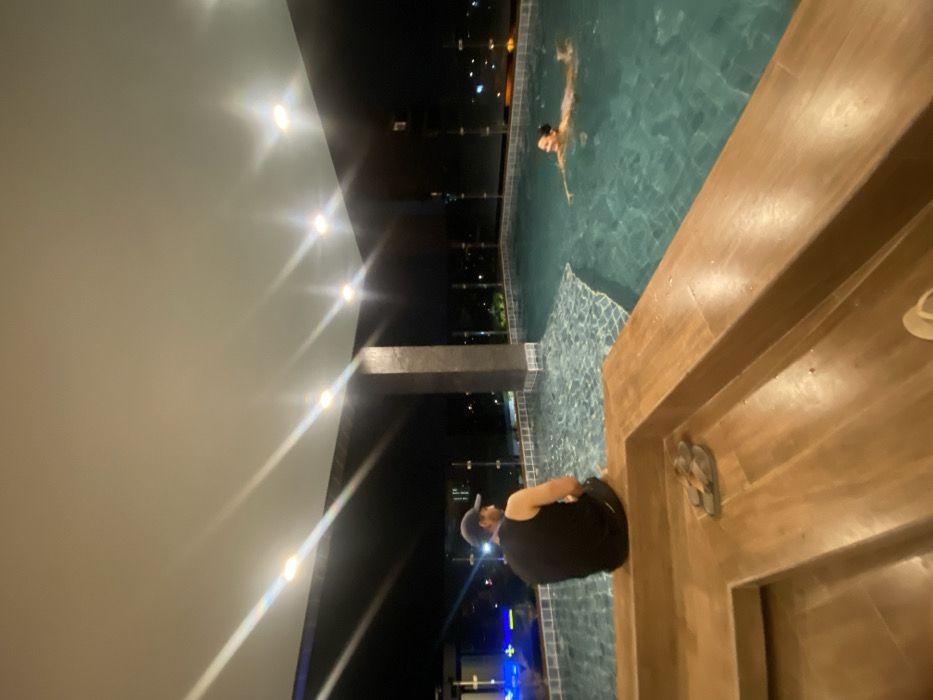 A person in a black shirt and baseball cap sits by the edge of an outdoor swimming pool at night. A swimmer is visible in the pool. The pool is surrounded by an illuminated city skyline. The scene is lit by overhead lights that run along a curved ceiling. A pair of flip-flops is placed on the wooden pool deck.