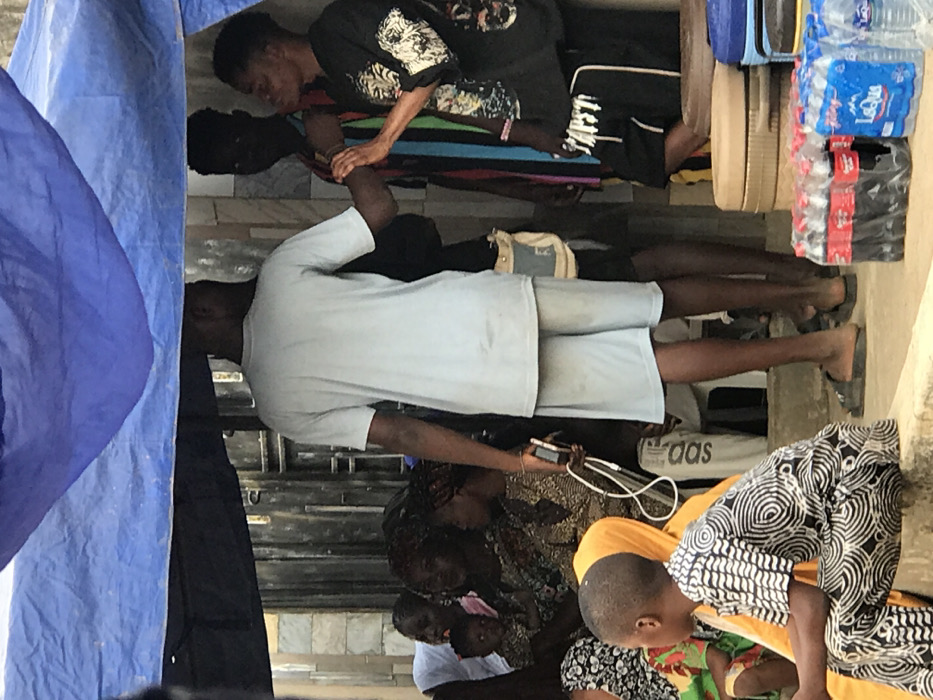 Several people are gathered under a makeshift structure, with a blue tarp visible on the left. Some individuals are standing, while others are seated on the ground. A man in a light blue shirt is looking at a phone. Bottled water and other items are stacked on a shelf. People are wearing casual clothing, and the overall scene suggests a gathering or waiting area.