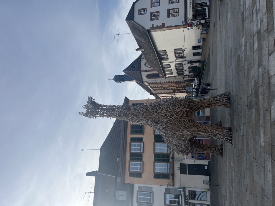 The image depicts a public square in Saverne, France, under a clear sky with scattered clouds, illuminated by natural daylight. A large, stylized sculpture, resembling a giraffe and constructed from interwoven light-toned wooden branches, stands prominently in the center foreground on a paved surface of light gray rectangular stone slabs. To the left of the sculpture, a multi-story building features a peach-colored facade with dark brown window shutters on its upper floors and a visible address "62" at street level. Further left, an adjacent building with a lighter facade displays a "RIBAS" sign. Both buildings have dark, pitched roofs. In the background, to the right of the sculpture, a large religious structure, likely a church, is visible with a dark conical spire and a reddish-brown tiled roof. Its facade incorporates light-colored stone and reddish masonry elements. A paved street slopes downwards to the right of this building, on which two white passenger vehicles are parked. Adjacent to this street, a white building with dark window shutters and exposed reddish-brown corner stones displays a "BOUTIQUE" sign. One indistinct individual is partially visible walking on the sloping street near the parked vehicles. No other discernible human activity or interactions are evident.