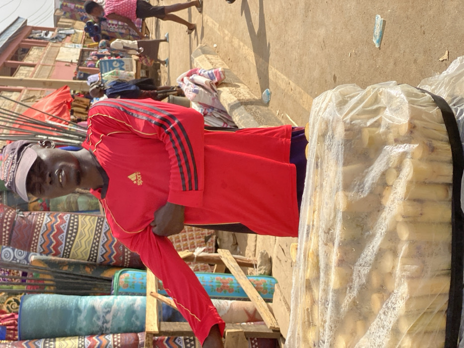 A man stands outdoors in a red long-sleeved shirt with black stripes and a baseball cap. He is surrounded by stacks of colorful patterned mats. To his right is a large bundle of what appears to be sugar cane, wrapped in clear plastic and held together with black straps. Other people walk by in the background of this street-market scene.