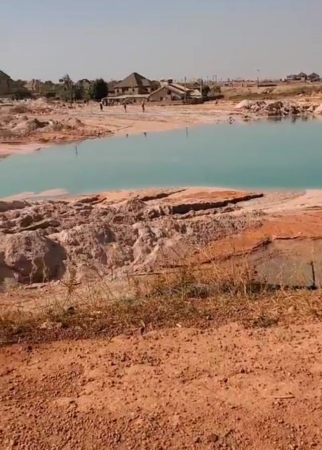 group of people working in a dug-out area that appears to be a mining site. The ground is reddish-brown and uneven, with small patches of vegetation. In the center of the area is a small, turquoise-colored pool of water. People are scattered around the edges of the pool, some standing and others sitting, possibly involved in the mining process. There are pipes and other equipment visible near the water. In the background, there are a few buildings and what appear to be piles of earth or materials. The sky is clear and blue, suggesting a sunny day. The overall impression is of an active, manual labor site.