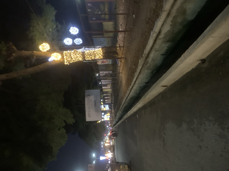 A nighttime street scene is captured from a low angle, showcasing a roadside with a concrete drainage channel. Decorative lights adorn trees and structures, with some arranged in spherical and rectangular patterns. Further down the road, a sign is visible on the left. Traffic is discernible in the distance, contributing to the urban setting. The overall lighting creates a contrast between the darkness and illuminated areas.