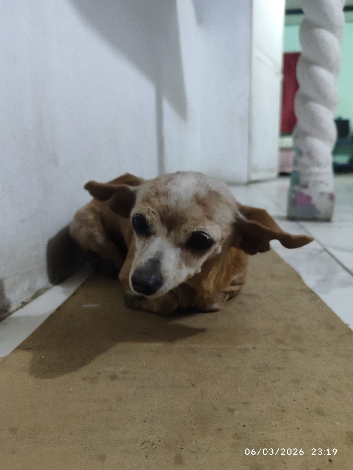 The image depicts an indoor scene in Tinaquillo, Venezuela, recorded on 06/03/2026 at 23:19. The central subject is a small dog, light brown in coloration with white markings on its muzzle and forehead, lying on a flat, light brown surface, possibly a mat or cardboard, in the foreground. The dog's dark eyes are directed towards the viewer, and its ears are upright and slightly splayed. A white wall forms the left boundary of the scene. In the background, a hallway or room entrance is visible. On the right, a white vertical column, appearing to be wrapped in a twisted or braided material, stands; its base exhibits faint pink and blue discoloration. Beyond the column, a light-colored wall or doorframe is present, with indistinct elements including a red object and a green hue in the deeper background. The floor in the background is tiled and appears lighter than the foreground surface. Illumination suggests an artificial light source, casting a notable shadow to the left of the dog on the brown surface.