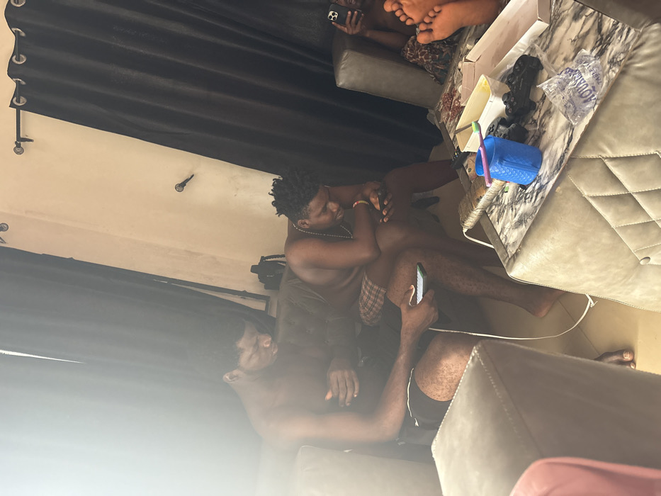 The scene depicts an indoor setting, identified as a residential or common area in Ikot Ekpene, Nigeria