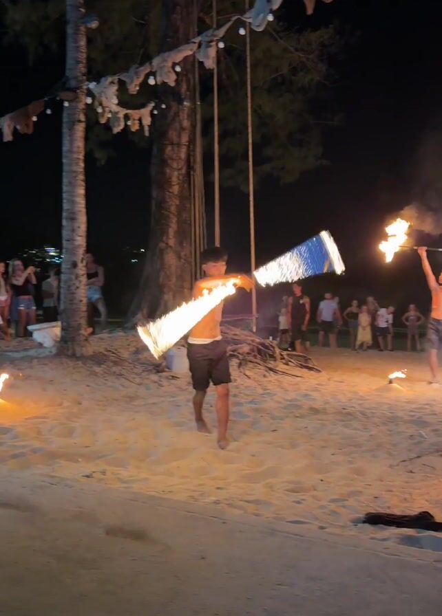 Two shirtless men perform a fire show on a beach at night. One juggles two rectangular objects on fire, while the other holds one long stick with flames. People stand watching. There are trees, a swing, and other burning fixtures on the beach.