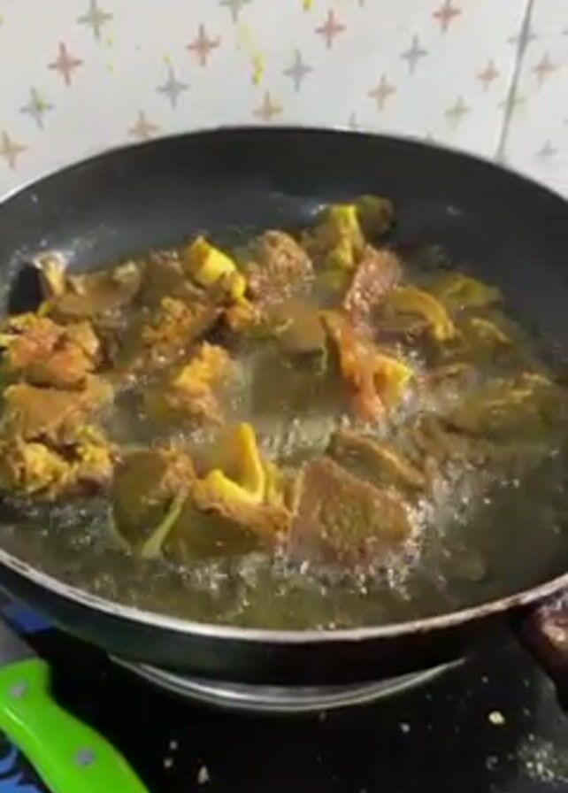 A frying pan sits on a black stovetop with an ornate blue and white floral pattern. Inside the pan, chunks of what appear to be meat are being deep-fried in oil. Bubbles churn around the food, indicating the oil is hot. Beside the pan, on the stovetop, rests a green-handled knife. The background features a tiled wall with a pattern of repeating beige crosses, some of which have yellow stains.