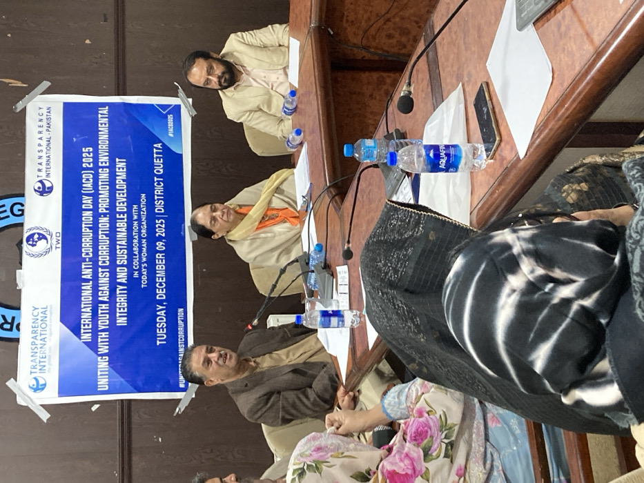 An indoor conference or meeting is depicted, occurring on Tuesday, December 09, 2025, in Quetta City Tehsil, Quetta District, Pakistan. The event is identified by a blue and white banner as "INTERNATIONAL ANTI-CORRUPTION DAY (IACD) 2025," themed "UNITING WITH YOUTH AGAINST CORRUPTION: PROMOTING ENVIRONMENTAL INTEGRITY AND SUSTAINABLE DEVELOPMENT," and organized in collaboration with Today's Woman Organization. The banner is affixed to a light-colored wall with tape. Three individuals are prominently seated at the head of a dark brown, polished U-shaped or rectangular table. From left to right: 1. A male, wearing a brown jacket over a light brown shalwar kameez, speaking into a black microphone. 2. A female, wearing a light-colored shawl draped over an orange garment, seated to the right of the first male. 3. A male, wearing a light beige suit jacket over a light-colored shirt, seated to the right of the female. Multiple black microphones are positioned on the table in front of the speakers. Numerous Aquafina branded plastic water bottles are present on the table, along with white papers and at least one smartphone. Several other individuals are partially visible in the foreground, seated at the table, facing the speakers. These include at least three females; one wears a floral patterned top, another a black hijab with white stripes, and a third a dark patterned garment.