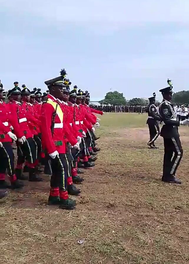 A group of uniformed people are marching in formation on a field. They are wearing red jackets with white and yellow accents, black pants, and black shoes. They also have distinctive black hats with what appears to be feathers. The field is mostly dry grass with some bare patches. In the background, there is a larger crowd of people watching, and a band can be seen further away. The sky is overcast. One person in the marching group is slightly ahead and to the side of the others. He appears to be directing the formation and is carrying what looks like a sword.