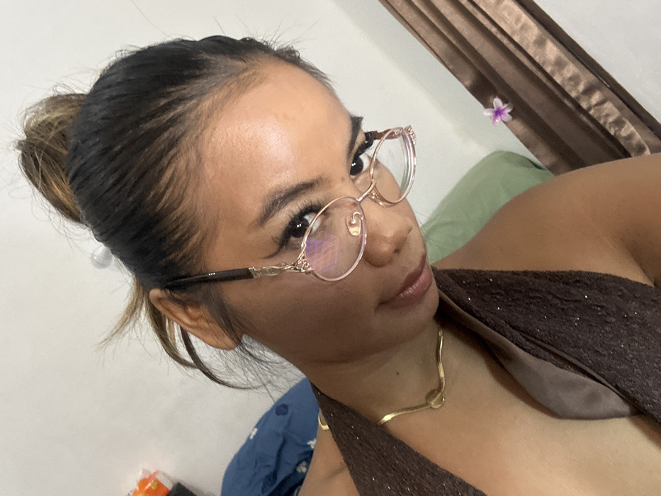 A close-up, high-angle photograph depicts an adult female indoors in Celuk, Indonesia. She has dark brown hair pulled back into a bun, with some wisps visible around her left ear and temple. She wears oval-shaped eyeglasses with ornate rose gold-colored metal frames. Her left eye is visible with defined eyelashes, and her gaze is directed slightly downwards towards the camera. Her facial expression is neutral. She is dressed in a dark brown, glitter-speckled halter-neck top, revealing a lighter brown or beige fabric underneath. A gold-colored snake-chain necklace with a central knot design rests on her clavicle. The background on the upper left consists of a plain white wall, a partial view of a blue fabric item, and a white plastic object with orange accents. The background on the right features a vertically folded brown curtain, with a small purple and white flower placed upon it.
