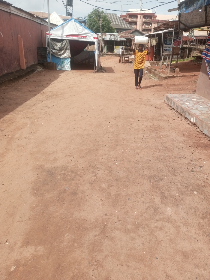 The image captures an unpaved street scene in Onitsha, Nigeria, under daylight