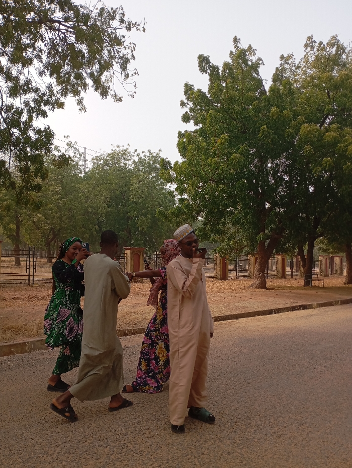 The scene depicts four individuals outdoors in the city of Kanti, Nigeria, during daylight hours. They are positioned on a paved asphalt surface. From left to right: 1. A female individual wears a dark green and pink patterned long dress and a head covering. She holds a dark smartphone in her right hand, pointing its camera towards the right, seemingly capturing an image or video of the individuals ahead. 2. A male individual wears a light beige long robe (jalabiya/thobe) and dark open-toed sandals. He is in motion, walking from left to right across the paved surface. 3. A female individual wears a dark floral long dress and a light-colored head covering. Her right arm is extended forward, with her hand positioned near the fourth individual. 4. A male individual wears a light beige long robe, a white cap, dark sunglasses, and dark shoes. He holds a dark rectangular object, possibly a smartphone or microphone, to his mouth/chin area with his left hand. He is standing, facing slightly left. The immediate environment features a dark paved surface. To the right of the paved area, a raised curb separates it from a drier, unpaved ground area. The background includes multiple trees with dense green foliage, suggesting an arboreal setting. Beyond the individuals and trees, a metal fence with concrete pillars is visible. The sky above is bright and clear, possibly hazy.
