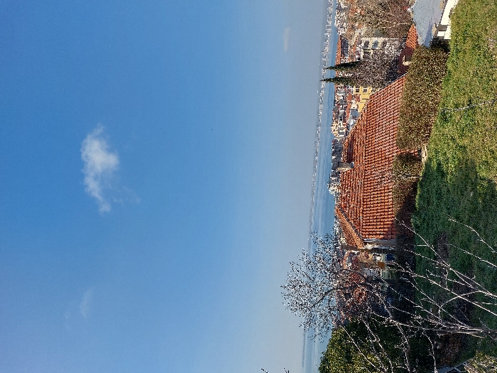 An elevated, panoramic view of Sveti Vlas, Bulgaria, is depicted under a bright, clear blue sky with a single distinct white cumulus cloud in the upper right quadrant and a faint wisp of a cloud to its left. The immediate foreground comprises a sunlit, grassy slope displaying patches of green and brown vegetation, with several deciduous trees showing bare, branched limbs. The midground features a cluster of urban structures, primarily characterized by numerous red terracotta tiled roofs, including one prominent, large, rectangular roof with a visible chimney. Interspersed among the buildings are various bushes and two tall, slender, dark green coniferous trees positioned to the right of the dominant tiled roof. The background reveals a calm, blue body of water, likely the Black Sea, extending horizontally across the frame, with a distant, densely developed coastline visible on the far horizon. No individuals or discernible actions are present.
