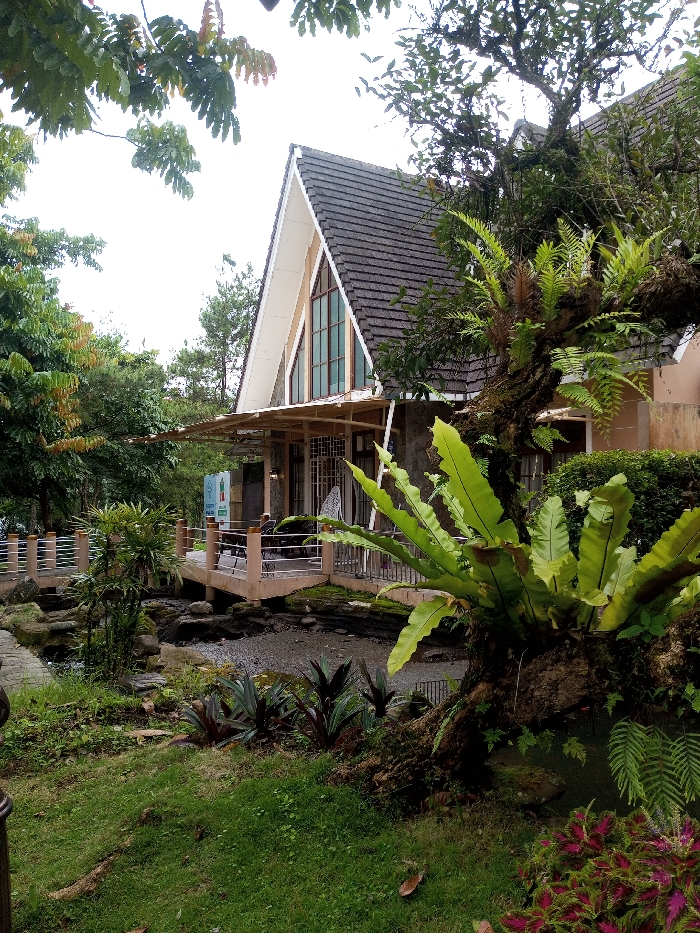 - "The image depicts a contemporary A-frame building situated amidst lush tropical and temperate vegetation in a garden setting within orehat, India, under an overcast sky" by FM-agByF3, licensed under CC BY 4.0
