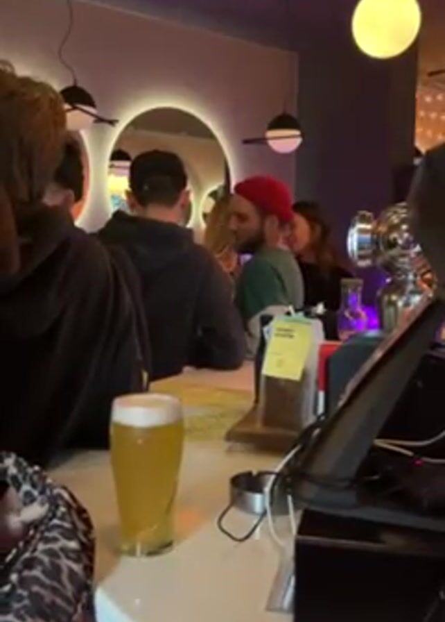 view from behind the bar in a bar or club. There are several people standing at the bar, facing away from the camera. In the foreground, a person in a leopard-print sleeve is holding a glass of beer on the bar. The bar is white, with a yellow patterned mat on it. Behind the bar, there are lights in the shape of planets and circular mirrors. A cash register, liquor bottles, and beer taps are visible on the bar, with a man in a red beanie standing towards the end of the bar. The ceiling is textured with star-shaped patterns. The light is low, with a glowing orb lamp providing brightness.