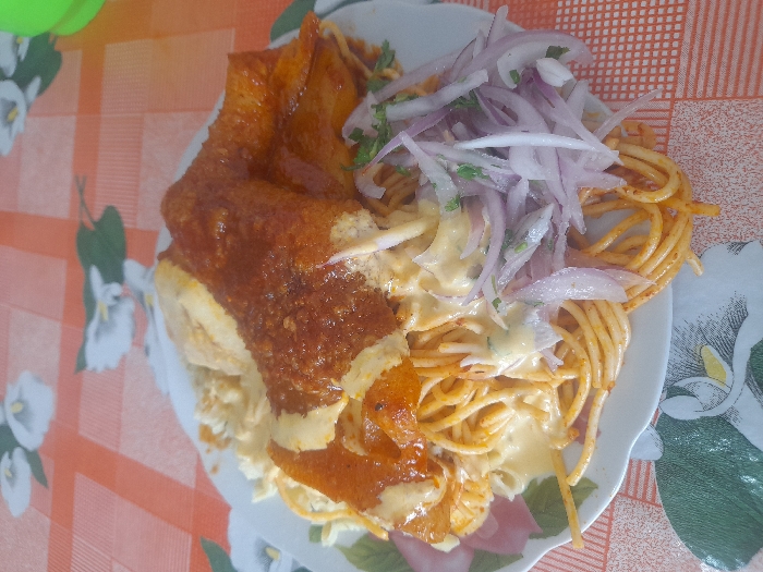 - "A plate of food is presented, featuring spaghetti, fried pork, and red onion" by FM-oKDhM2, licensed under CC BY 4.0
