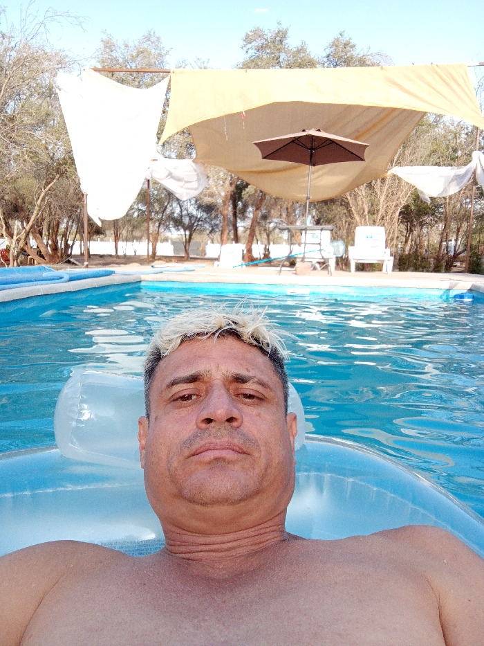 A man floats in a pool on a clear inflatable tube. He has short, dyed blond hair and is shirtless. Behind him is a blue swimming pool with chairs and tables under sunshades. The sky is a clear blue. Trees surround the pool area.