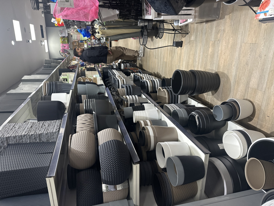 The image portrays the interior of a retail store located in Heilbronn, Germany, specifically an aisle dedicated to home and garden merchandise. The left side of the aisle features extensive multi-tiered shelving displaying numerous plant pots and planters. These objects exhibit a variety of sizes, shapes (round, square, oblong), colors (black, grey, white, beige, brown, light green), and textures, including ribbed, woven patterns, and simulated stone finishes. They are arranged in stacks, nested configurations, and individual placements on the shelves. In the mid-ground, a single adult male is present, facing away from the camera and slightly to the right, appearing to browse merchandise on the right side of the aisle. He has dark hair and a beard, and is dressed in a dark zippered jacket, light brown trousers, and white athletic shoes. His hands are placed in his pockets. The right side of the aisle contains additional retail displays, including colorful plastic household items, brushes, a conspicuous pink mesh bag, and rolled materials resembling fabric or canvas. A black, two-tiered metal stand with decorative elements is positioned on the floor to the right, between the central aisle and the right-side displays. The flooring throughout the visible area is light-colored laminate, arranged in a wood-plank pattern. The ceiling features multiple square recessed lighting fixtures, providing artificial illumination to the store environment.