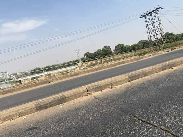 The image captures an outdoor static scene in Dadi Riba, Nigeria, under a hazy sky. The foreground shows an asphalt road exhibiting cracks, bordered by a concrete curb separating it from a sandy/dirt shoulder. A concrete median divides the visible road section. In the midground, a large metal lattice power transmission tower stands on the right, supporting multiple overhead lines. To the left, a white-painted metal truss bridge spans a body of water, featuring railings along its length. Another, smaller power pylon is visible beyond the initial bridge section. A wooden or light-colored metal fence runs parallel to the road and bridge. The background displays a distant tree line and faint architectural outlines on the far side of the water. No individuals, vehicles, or active subjects are present in the frame.