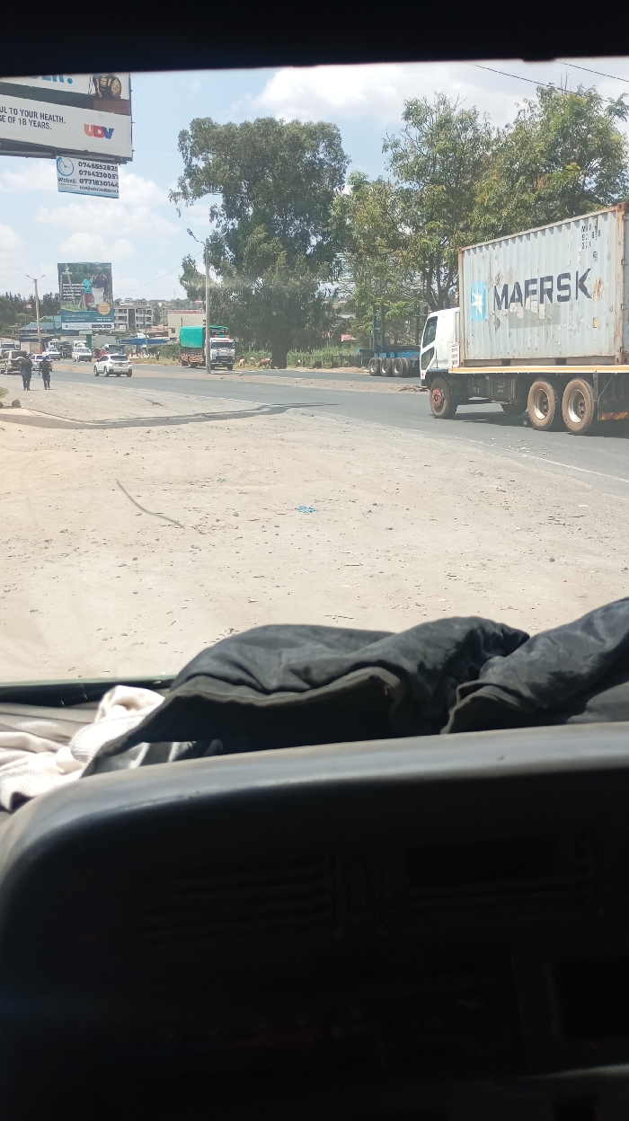 Captured from inside a vehicle, the image reveals a bustling roadside scene. A Maersk container truck dominates the view, moving right. In the background, other vehicles and pedestrians traverse the road. A sign advertising "UDV" is visible, with telephone numbers, alongside other billboards. The landscape is marked by sparse vegetation and arid ground. The interior of the vehicle is partially visible at the bottom of the frame, showing the dashboard.