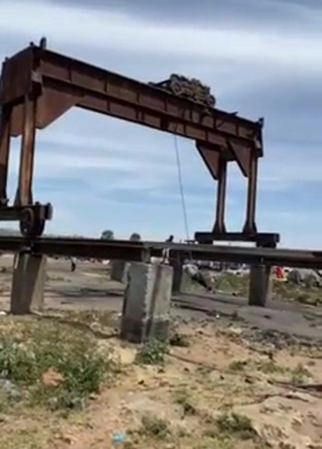 large, weathered, brown metal gantry crane standing on a railway-like structure supported by concrete pillars. The surrounding area appears to be a field or open space with sparse vegetation and scattered debris. In the background, numerous vehicles are visible, suggesting a junkyard or storage area. A few people can be seen walking around near the crane.
