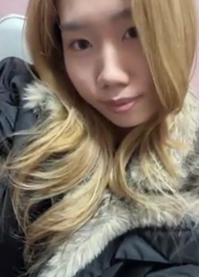 close-up of a young woman with long, blonde hair and light skin. She is wearing a black coat with a faux fur collar. The background is a light pink wall with small heart decorations. The woman looks directly at the camera with a slight smile and touches her hair. The camera is hand-held and slightly shaky.