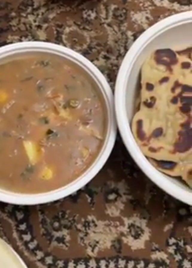 table setting with a brown patterned tablecloth. There are two white bowls on the table. One bowl contains a brown soup or stew with visible chunks of potato and green vegetables. The second bowl holds several pieces of flatbread, some with slightly charred spots. A glass of dark red liquid is visible in the background. The camera focuses on the food, providing a close-up view of each bowl. There are plates on the left as well.
