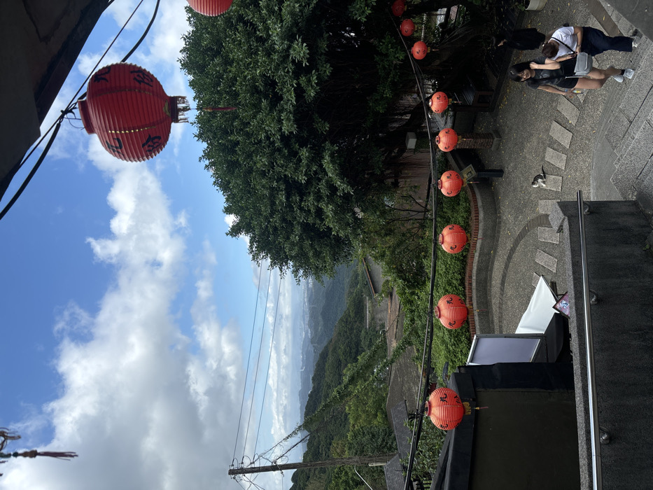 A line of red paper lanterns ascends along a hillside path. Lush green trees line the path, with glimpses of distant mountains in the background. A partly cloudy sky contrasts with the vibrant lanterns. Two people walk on a stone pathway, accompanied by a cat. The scene is captured from an upward-tilted perspective, emphasizing the height and scenic view. A utility pole with wires extends across the foreground.