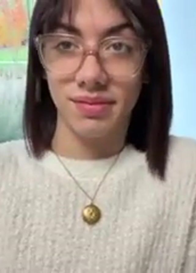 A young person with dark brown hair, wearing glasses and a white sweater, is looking at the camera