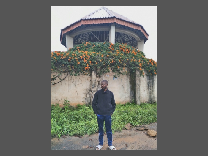 An adult male stands in the foreground, facing slightly left with his hands in the pockets of a dark jacket. He wears blue jeans and white slide sandals. The ground beneath him is unpaved, consisting of damp earth, small rocks, and patches of green vegetation. Behind him, a weathered concrete wall is covered extensively with green foliage featuring numerous bright orange trumpet-shaped flowers. Above the wall, the upper section of an octagonal or hexagonal structure is visible, featuring a corrugated metal roof with a reddish-brown trim and supporting pillars. The sky overhead is overcast. The scene is situated in Daxing District, China.