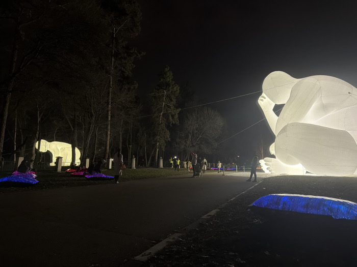 The image captures an outdoor night scene within Borisova Gradina (Boris' Garden) in Sofia, Bulgaria, during a light festival, likely the LUNAR Festival of Lights