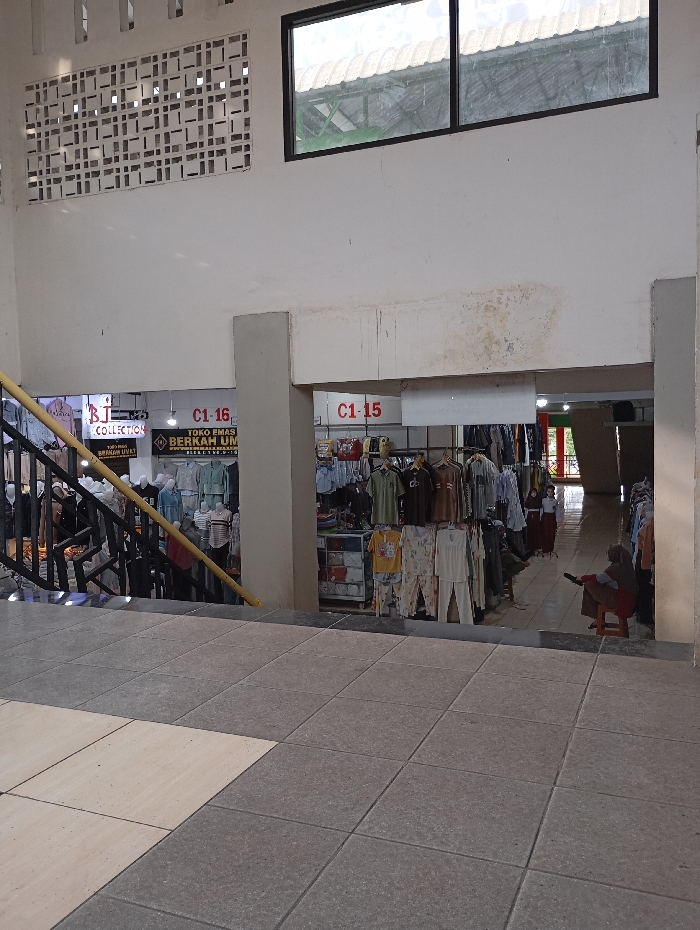 The image captures an indoor commercial area, likely a market or a section of a mall, located in the city of Unknown, Unknown. The perspective is from a tiled floor with alternating light beige and dark grey squares. To the left, a dark metal staircase with a yellow handrail descends. The background features white walls. The upper left wall has a decorative rectangular ventilation block pattern. Above the center, a black-framed window offers a view of a corrugated metal roof structure. Below a horizontal white beam, two clothing stores are visible. Store C1-16, on the left, displays "BJ COLLECTION" and "TOKO BERKAH UMAT" signage, featuring clothing on mannequins and racks. Store C1-15, to the right, showcases various garments, including pajamas, on hangers and shelves. A person wearing a dark head covering and a reddish-brown top is seated on a low wooden stool at the entrance of C1-15, looking down at an object in their hands. Two other individuals are partially visible deeper inside store C1-15, and one person is partially seen near the staircase to the left. The white walls exhibit some minor staining and discoloration, particularly on the beam above C1-15.