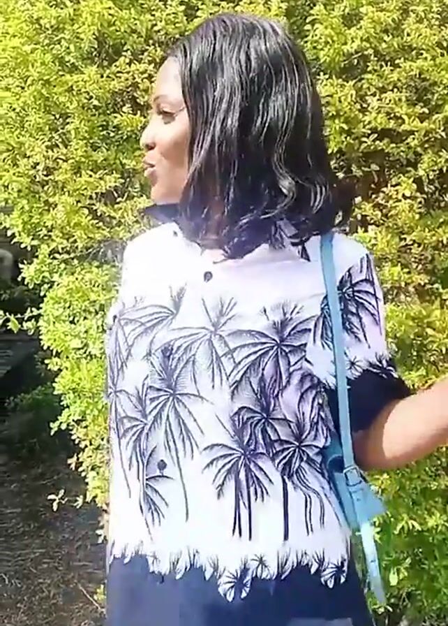 A woman stands in front of a green bush, talking and gesturing with her hands. She wears a short-sleeved white button-down shirt with a black palm tree design and a small blue purse slung over her shoulder. She is smiling.