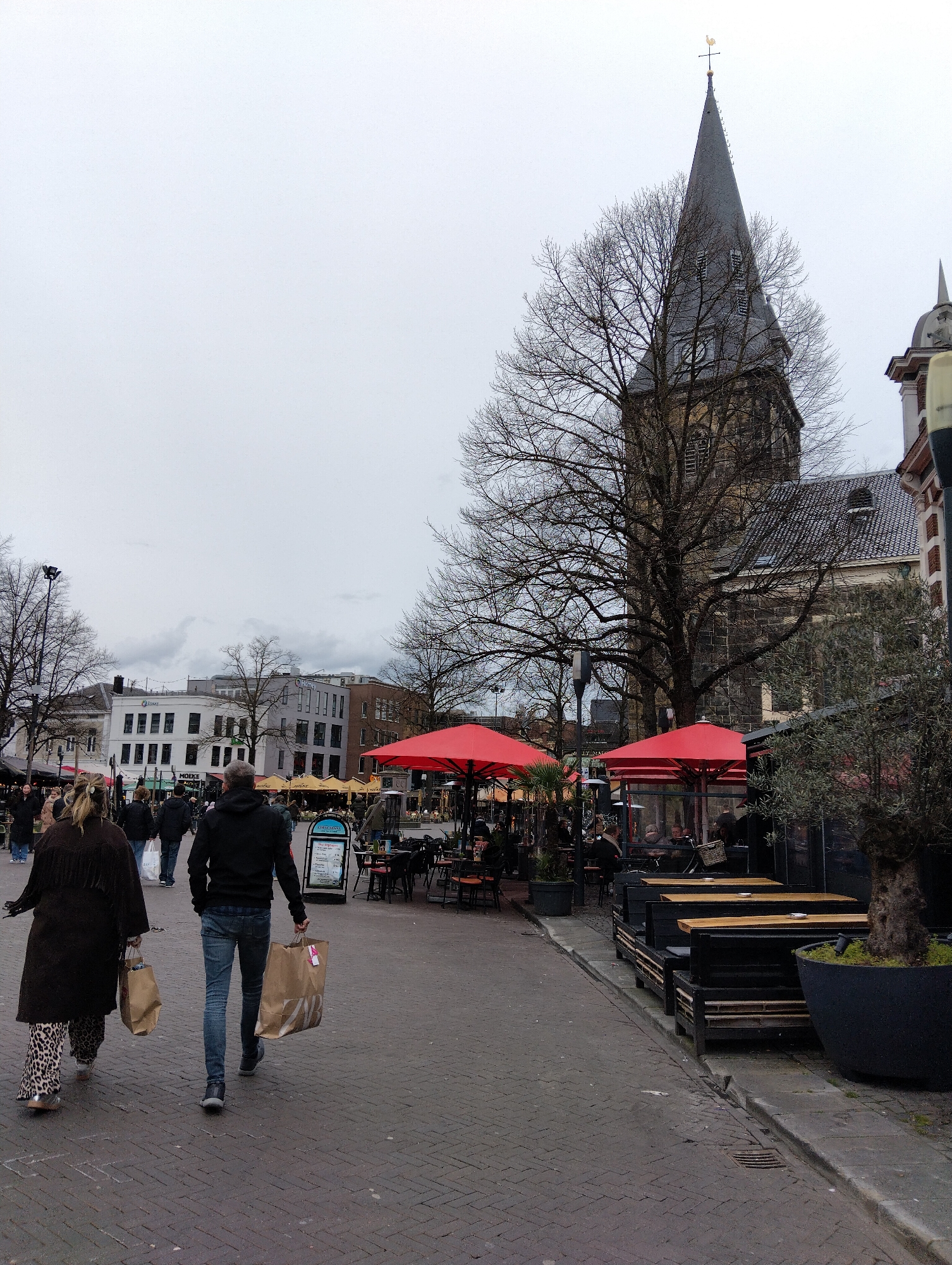 The image captures a street scene in Enschede, Netherlands, identifiable by the Grote Kerk church visible in the background. The sky is overcast. In the foreground, two people are walking away from the camera, both carrying shopping bags. A man in jeans and a black hoodie carries a Zara-branded bag. A woman in a brown coat and leopard-print pants also carries a shopping bag. To the right, outdoor seating for restaurants is visible, with red umbrellas covering some tables. Other pedestrians are scattered throughout the scene. The street is paved with bricks.