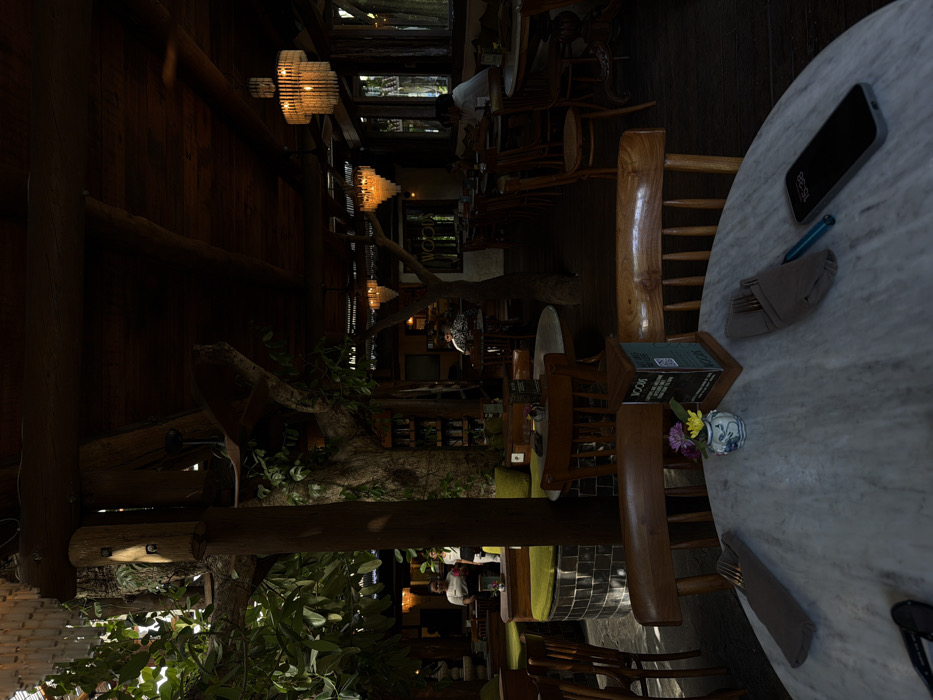 An overhead shot shows a busy restaurant. The focus is on a round, marble-top table, featuring a phone, glasses, a menu, and a small vase with flowers. Wooden chairs surround the table. In the background, there are views of a treehouse-style establishment with lush green plants and hanging light fixtures. People are seated at tables and some are walking through the restaurant. The overall ambiance is warm and rustic.