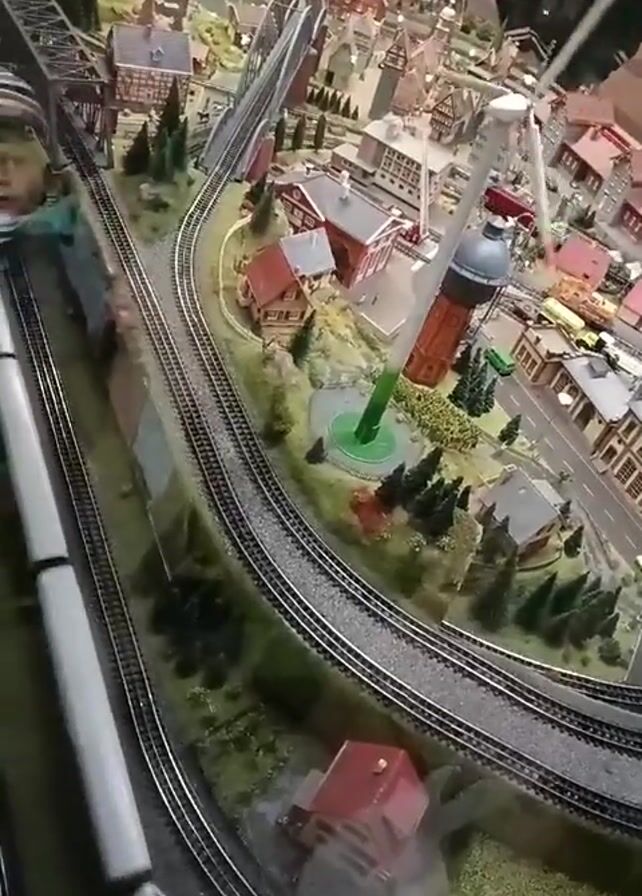 From an elevated, canted angle, the video captures a miniature train set complete with a miniature town, train tracks, and a model train. The miniature town features several buildings, including houses with red roofs, a red brick water tower, and a windmill. The train tracks wind through the miniature landscape, with a model train visible in the lower left corner of the frame. The train is silver and appears to be in motion. Additionally, a child's face, wearing a striped hat and green jacket, is briefly visible reflected in the glass casing of the train set. The overall environment is indoors, with the train set seemingly displayed behind a glass pane.