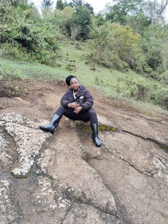 A single individual is seated on a large, weathered rock formation in Ndathi, Kenya. The individual, an adult female with dark skin and black braided hair, is wearing a black puffer jacket over a white top, black trousers, and black rubber boots. Multiple light-colored bracelets are visible on her left wrist. She holds a black smartphone with a light-colored case in her right hand, resting on her lap. The subject is positioned facing slightly left of the camera, with her gaze directed towards the lens. The background features a gradual hillside covered in green grass, varied bushes, and trees under an overcast sky. The immediate foreground and midground are dominated by the extensive, light grey-brown rock surface, displaying irregular textures and some lighter mineral or lichen deposits.