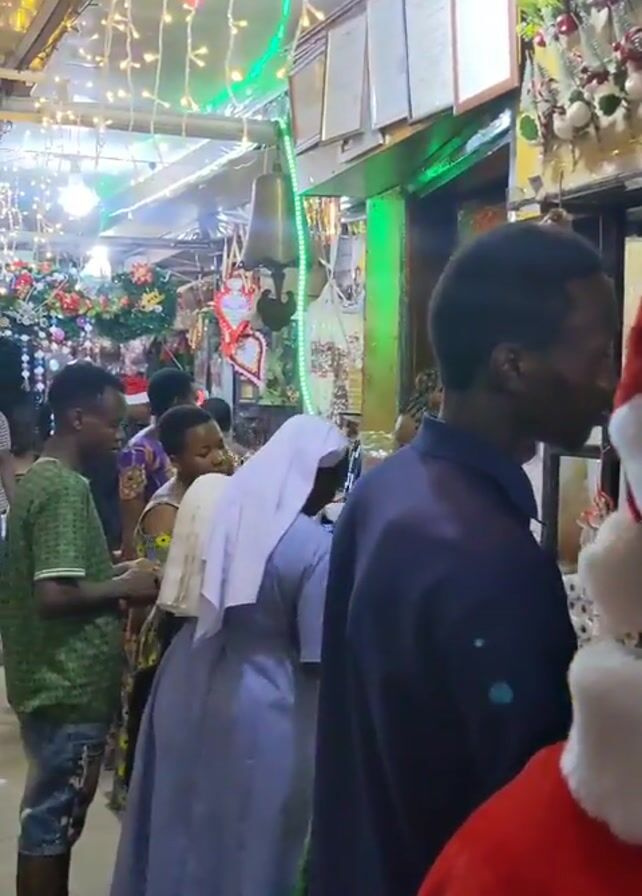 interior of a store, possibly during the Christmas season based on the decorations. The store is crowded with people, including a nun in a light blue habit and white veil. A man in a green patterned shirt and jean shorts stands near the nun. Another man in a navy jacket is also in the frame. Strings of Christmas lights adorn the ceiling, and various decorations such as wreaths and ornaments are visible on the shelves. A person in a Santa Claus costume is partially visible in the right foreground. Some people are standing and browsing, while one individual sits on the floor in the background. The scene appears busy and somewhat cramped due to the number of people in the small space.