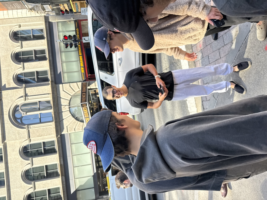 Five young adult males are gathered on a city street or sidewalk during a bright, sunny day in Boston, Massachusetts, specifically on Washington Street in front of the establishment "French Quarter - New Orleans Kitchen & Cocktails" at address 545. In the center of the image, a male with glasses, wearing a black t-shirt and light grey sweatpants, stands smiling, holding a smartphone in both hands. He is looking at the individuals to his right. To the immediate left of the frame, another male is seen from behind, wearing a blue denim-style baseball cap with a "Von Dutch" logo and a dark grey hooded sweatshirt. To the right, partially visible, is a male wearing a blue Boston Red Sox baseball cap and a tan, textured hooded pullover, looking towards the smiling man. Further to the right in the foreground, the back of a male's head with a dark baseball cap is visible, holding a black smartphone. A fifth male with sunglasses on his head is partially visible in the background on the far left, near a white van. Behind the group, parked on the street, is a white SUV, and the aforementioned white van. A traffic light displaying red is visible on the right side of the street, accompanied by a "NO TURN RED" sign. The background features a multi-story building constructed of light-colored stone or brick, characterized by several arched windows on its upper floors and a prominent arched entrance at street level with the "FRENCH QUARTER" and "NEW ORLEANS KITCHEN & COCKTAILS" signage.