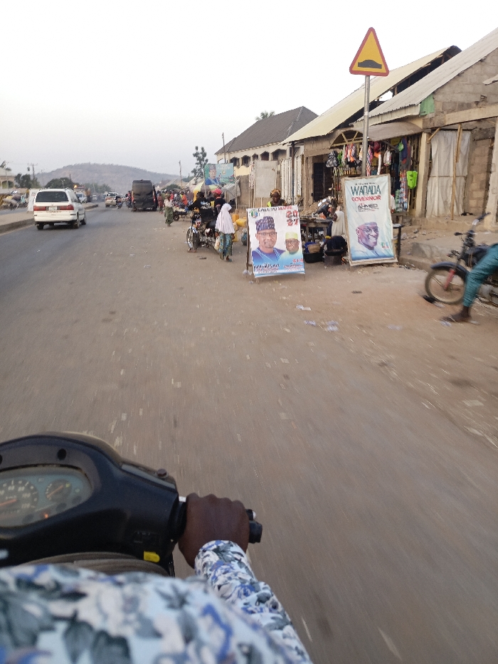 From the vantage point of a moving motorcycle, the image captures a bustling street scene. Shops line the right side of the road, displaying political campaign posters. People mill around, some on motorcycles. Traffic flows in the distance, with a white SUV and a dark van being visible. A yellow road sign warns of a bump ahead. The sky is overcast, suggesting either early morning or late afternoon.