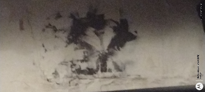 The image displays a severely blurred, low-resolution view of a light-colored, likely off-white or pale grey, surface. Irregular, amorphous dark grey to black patterns or marks are prominent across the central and right portions of the frame, contrasting with the lighter background. These dark formations exhibit varied densities and shapes, with some areas appearing fractured or layered. A more uniform vertical strip of the light-colored surface is visible along the left edge. No discernible individuals, specific objects, or actions are identifiable due to the extreme lack of clarity. The scene depicts a static interior environment. The image is located in Rochester, United States.