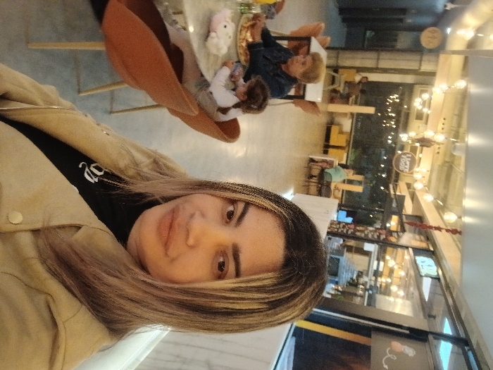 A person takes a selfie inside a well-lit establishment with high ceilings and a variety of lights. Other people sit at a table in the background. There is a chair and table in the background. The establishment looks like a restaurant, mall, or entertainment venue. The selfie taker wears a light-colored jacket and has light-colored hair.