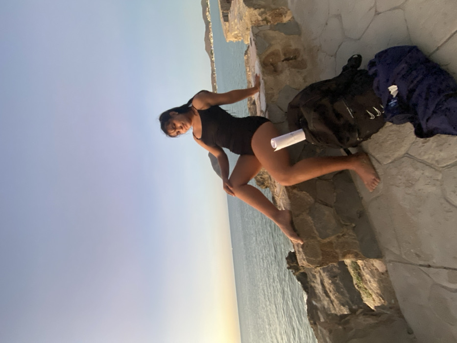 A woman in a black swimsuit balances on a stone ledge overlooking the ocean. One hand rests on a higher part of the wall for balance, while the other is extended. A rolled paper rests beside her thigh, next to a black backpack and blue cloth on the stone surface. The sky transitions from a light blue to a yellow horizon, suggesting sunset or sunrise. Buildings are faintly visible in the distance across the water.