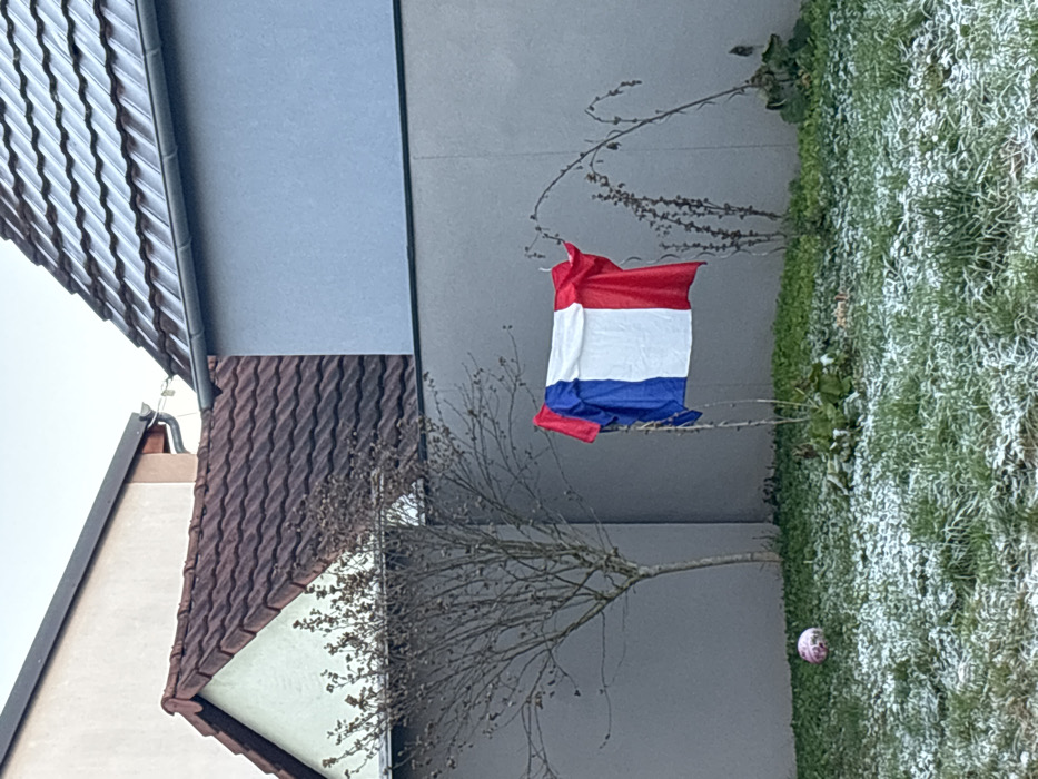 This image depicts a residential backyard scene in Ostwald, France, on a cold, clear day. The foreground features a green lawn partially covered with a sparse layer of white frost. A pink and white patterned soccer ball rests on the frosty grass to the left. In the mid-ground, a bare deciduous tree with thin branches stands to the left. To the right of the tree, a French flag, characterized by its vertical blue, white, and red stripes, is draped and hanging, possibly on a clothesline or small plant supports. The flag's fabric appears somewhat stiff or textured. Behind the lawn and vegetation, a uniform grey wall acts as a boundary. In the background, sections of two residential buildings are visible: one with a light beige wall and a brown tiled roof to the left, and another with a light blue-grey wall and a darker grey tiled roof to the right. A silver gutter runs along the eaves of the rightmost building. The sky above is clear and light. No individuals are present in the scene.