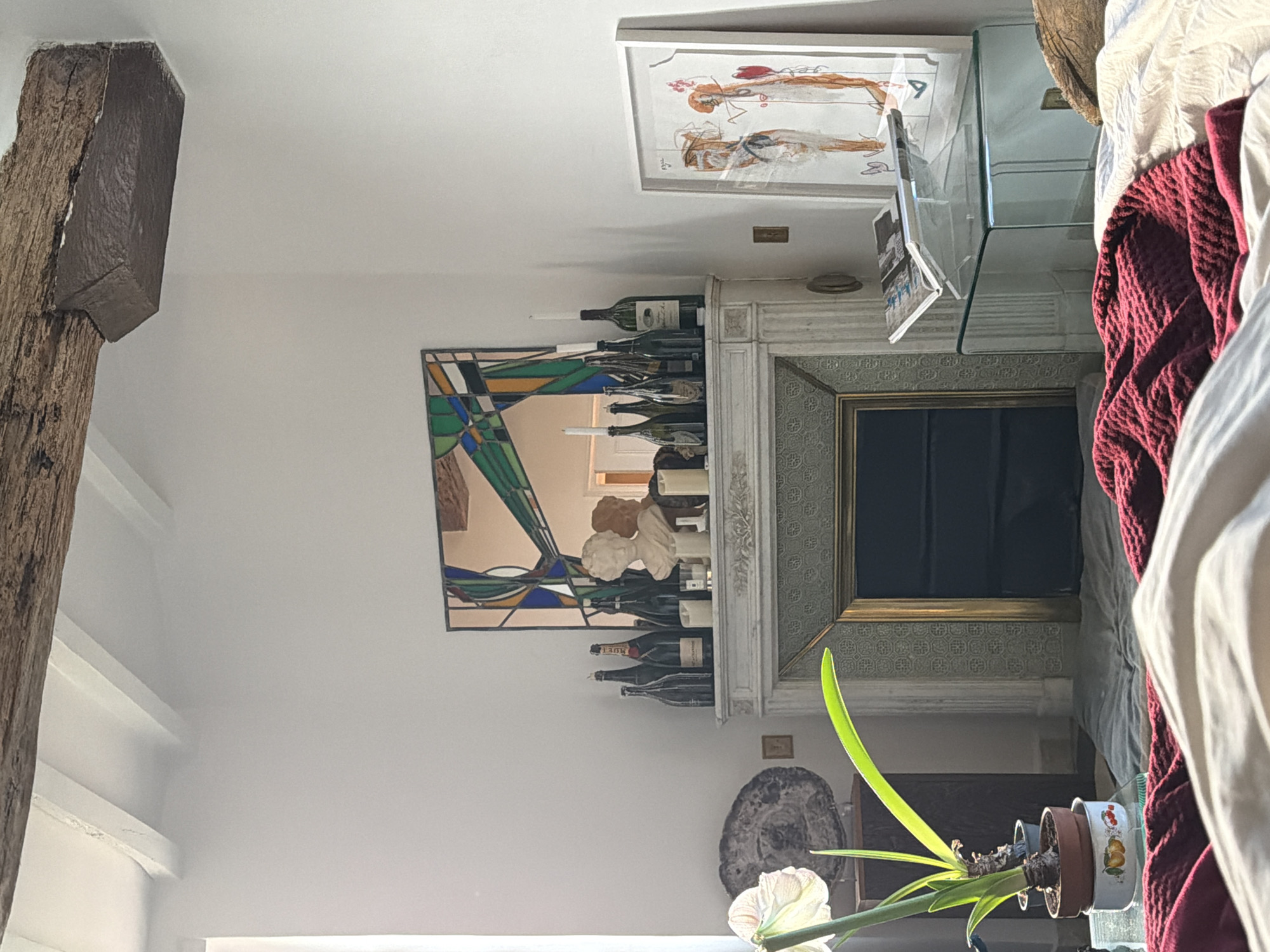 This image depicts an interior room, specifically a bedroom or living space, in Mauléon-d'Armagnac, France. The scene is illuminated by natural light entering from a window on the left. The ceiling features exposed wooden beams, one large dark brown beam running horizontally across the top of the frame, and several smaller white painted beams perpendicular to it. The walls are uniformly white. Centered in the image is a white marble fireplace mantle with fluted columns and a patterned gold-trimmed tile surround. The fireplace opening is dark. On the mantlepiece, a stained-glass style geometric mirror in greens, blues, oranges, and black is positioned above a white classical bust. Flanking the bust are approximately ten assorted wine and champagne bottles, including one identifiable as Moët & Chandon. Two tall white taper candles and two smaller white votive candles are also present on the mantle. To the left of the fireplace, a dark wooden side table displays a large, dark, polished geological specimen, possibly petrified wood, on a stand. In the foreground, a potted plant resembling an amaryllis, with a prominent white flower and long green leaves, is situated in a terracotta pot resting in a decorative bowl with fruit motifs. To the right of the fireplace, a framed vertical artwork with abstract figures in warm earth tones is leaning against the wall. Adjacent to this, a transparent glass cube table holds an open magazine or book, with a pen resting on it, possibly supported by a clear stand. The foreground reveals a bed partially covered by a white duvet and a textured dark red knitted throw blanket. No individuals are present in the scene.
