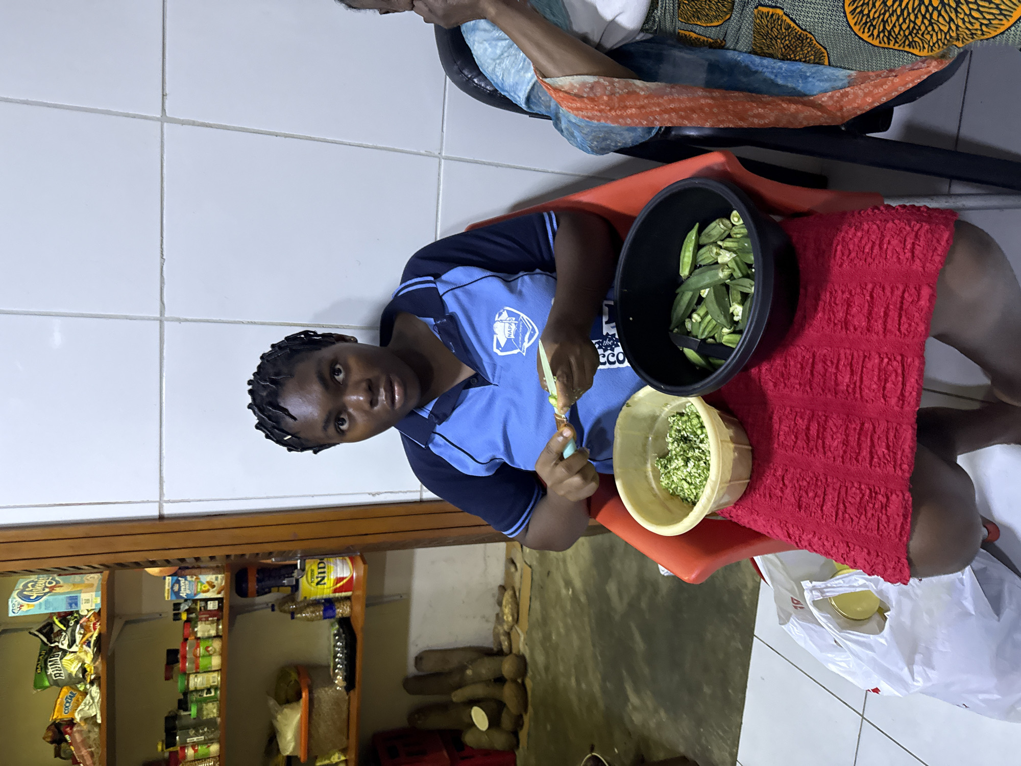 In a domestic kitchen or pantry setting in Alaguntan, Nigeria, a young woman is seated on a red plastic chair, facing forward. She wears a blue and dark blue collared polo shirt featuring a "NAPA" logo, and her hair is styled in dark, short braids. She is actively preparing green okra pods, holding one in her left hand and a small, light green peeling tool in her right. Two containers rest on her lap: a yellow bowl holding finely chopped green okra, and a black pot containing whole and partially trimmed green okra pods. To the right, partially visible, is an older individual seated on a black chair, wearing a patterned garment and an orange and blue scarf. The background on the left features a wooden shelving unit with four visible shelves, stocked with various items including packaged snacks (e.g., "Rumba," "Cocktail"), jars of spices, bottles, a carton of "Okey!" cereal, and a can of "NIDO" milk powder. Below the shelving unit, on the light-colored tiled floor, several large, brown root vegetables resembling yams are arranged on what appears to be cardboard. The wall behind the individuals is white-tiled. A white plastic bag rests on the floor in the lower left foreground. The scene is illuminated by interior lighting.