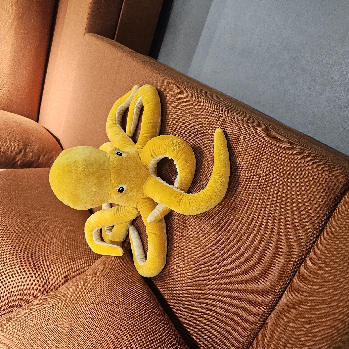- "A yellow plush octopus toy sits on a brown textured sofa" by FM-63mZD2, licensed under CC BY 4.0