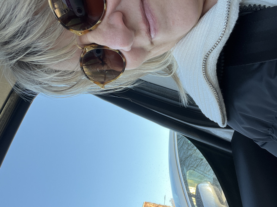 The scene is located in Saint-Galmier, France. The image presents a close-up view of a person seated inside a vehicle. The person, partially visible from the chest up, has blonde and graying hair and is wearing round, tortoiseshell-patterned sunglasses. Their right cheek, nose, and mouth are visible, displaying a slight smile. The individual is wearing a black puffer jacket over a white ribbed collar that features a distinct silver-colored metallic trim along its edge. The interior of the vehicle, specifically a dark door frame and pillar, is visible on the left side of the frame. Through the vehicle's window, a clear, bright blue sky is prominent. Below the sky, a portion of a silver or light-colored vehicle is parked, reflecting bare tree branches on its surface. A reddish-brown building structure is partially visible in the distant background on the far left. The environment appears to be an outdoor setting during daytime with clear weather.
